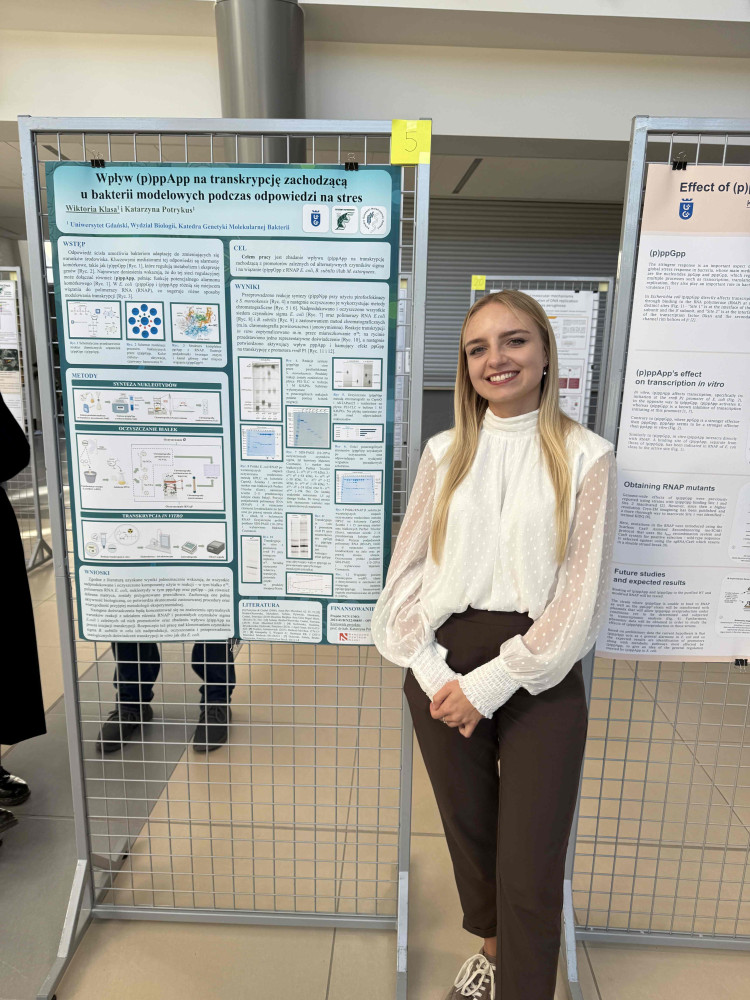 Pierwsze miejsce zajęła Wiktoria Klasa z Katedry Genetyki Molekularnej Bakterii (promotor: prof. dr hab. Katarzyna Potrykus) za poster pt. „Wpływ (p)ppApp na transkrypcję zachodzącą u bakterii modelowych podczas odpowiedzi na stres”.