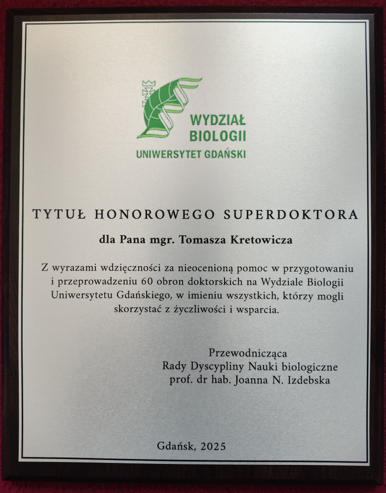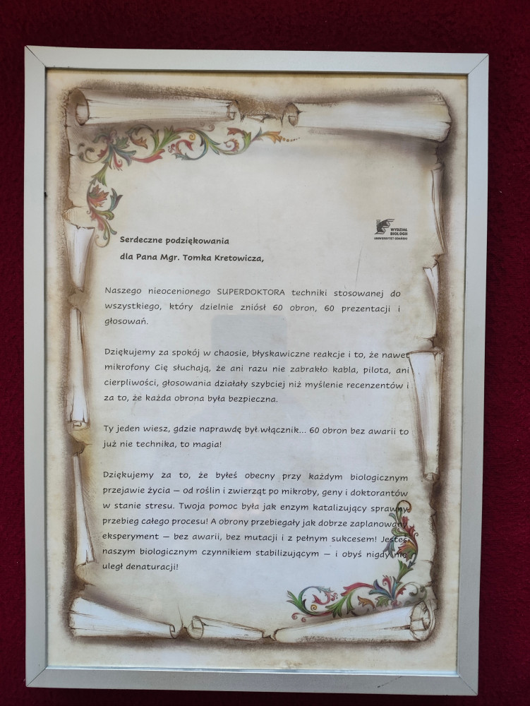Szczególnym wyróżnieniem uhonorowany został Pan mgr Tomasz Kretowicz, absolwent i pracownik naszego Wydziału, dzięki któremu wszelkie aspekty obsługi informatycznej wydarzeń wydziałowych i obron zawsze przebiegają wzorowo.