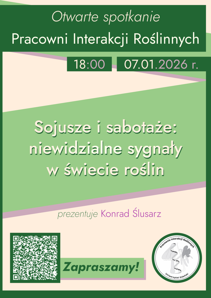 Już w najbliższą środę 07.01.2026r. o godz. 18.00 odbędzie się seminarium, podczas którego nasz magistrant Konrad Ślusarz wygłosi prelekcję pt. "Sojusze i sabotaże: niewidzialne sygnały w świecie roślin".