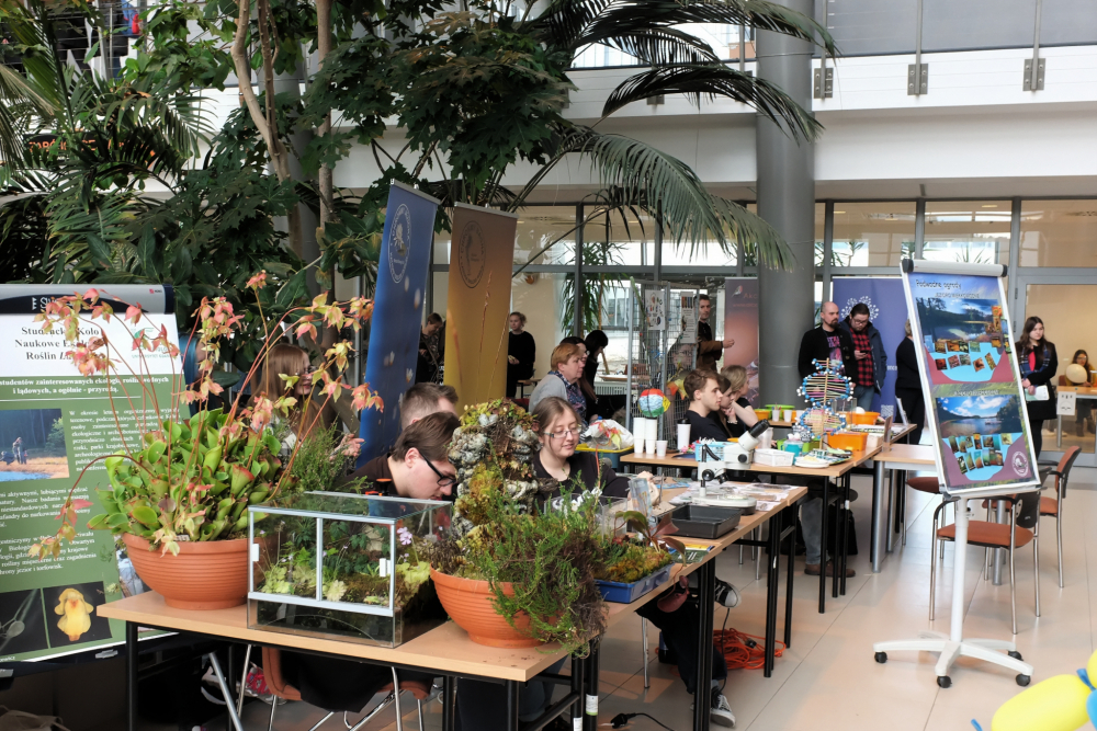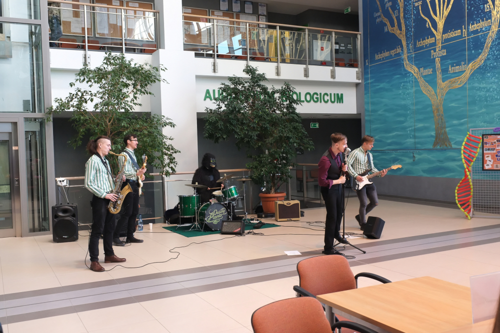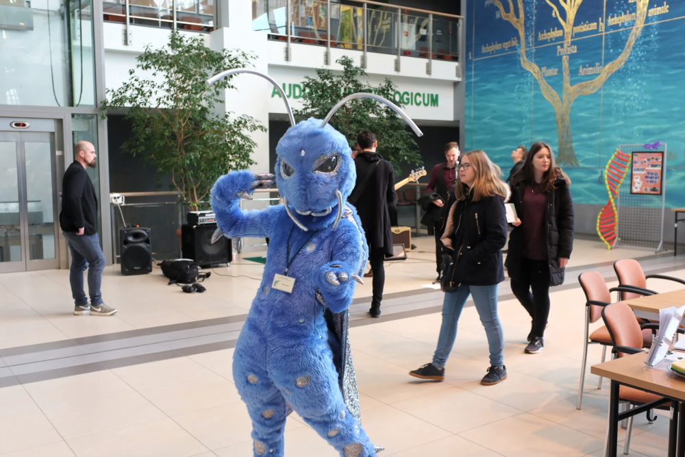 W tym roku na Dniu Otwartym naszego Wydziału zaprezentowały się Studenckie Koła Naukowe, studenci kierunku Genetyka i Biologia Eksperymentalna oraz rock'n'rollowy zespół Deadly Plants, który swoimi występami rozruszał zgromadzoną publiczność. Pojawił się również jeden błękitny karaczan wdzięcznie pozujący do zdjęć, grający na perkusji goryl górski, a także wyjątkowo przystojny płetwonurek. Przy stoiskach Kół goście Dnia Otwartego mogli zapoznać się ze specyfiką ich działania i projektami badawczymi, sprawdzić swoją wiedzę w różnych konkursach oraz wziąć udział w mini-warsztatach. Punkt Informacyjny pomagał odnaleźć się w programie Dnia oraz udzielał informacji o ofercie edukacyjnej Wydziału.